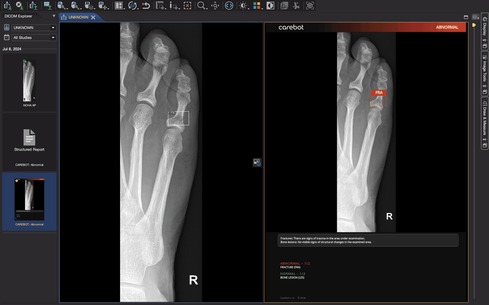 Carebot integrates directly into existing PACS and RIS systems without requiring changes to established workflows. Radiologists work in their familiar environment and make decisions as usual, supported by AI insights available at the right time.