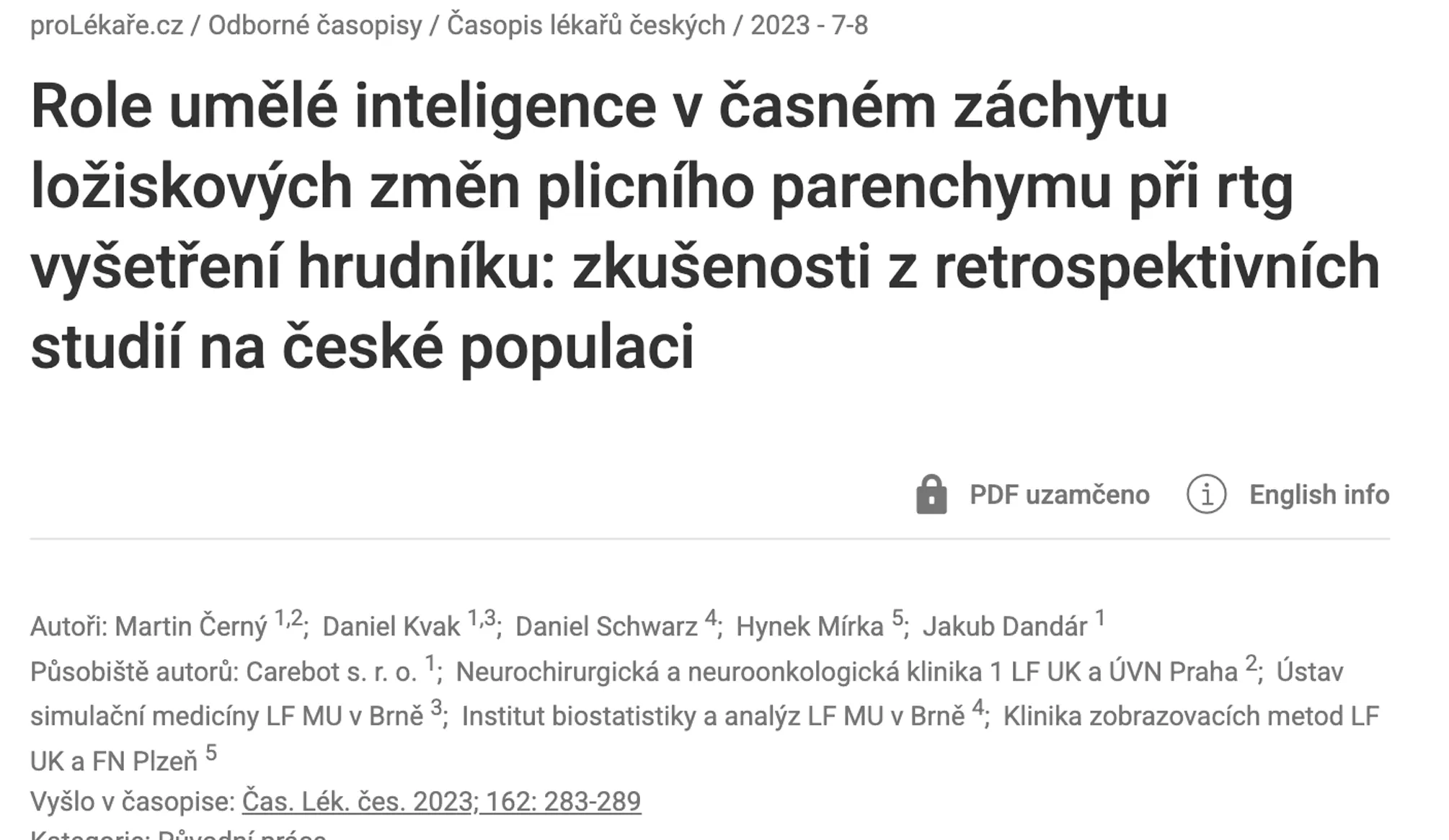 Studie analyzovala roli modelu umělé inteligence založeného na hlubokém učení pro včasné odhalení plicních lézí na rtg snímcích hrudníku pomocí dat ze dvou retrospektivních českých kohort. Hodnocení pokrývalo jak obecné nemocniční prostředí s nízkou prevalencí lézí, tak specializované onkologické prostředí. Výstupy AI byly porovnávány s interpretacemi radiologů napříč různými úrovněmi zkušeností, přičemž jako reference sloužila shoda expertů.