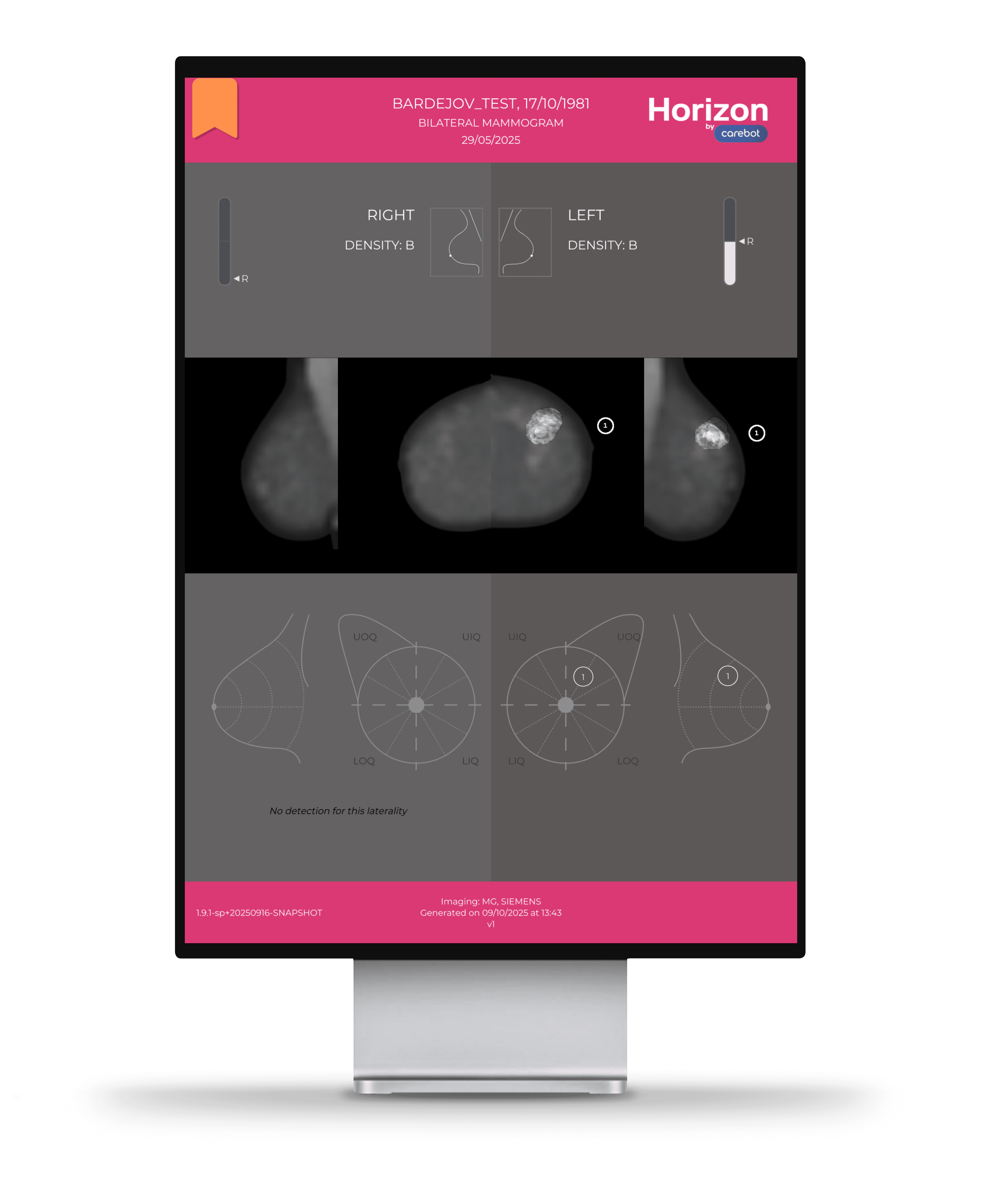 AI for MMG is part of the extended Horizon by Carebot portfolio, which brings together solutions from Carebot and our close partners. Within this portfolio, we provide Breast-SlimView (developed and owned by Hera–Mi).